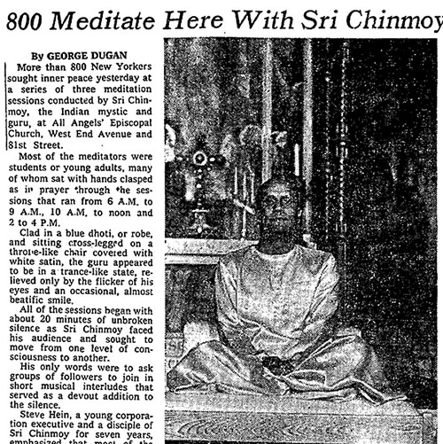"More than 800 New Yorkers sought inner peace yesterday at a series of three meditation sessions conducted by Sri Chinmoy, the Indian mystic and guru at All Angels' Episcopal Church…