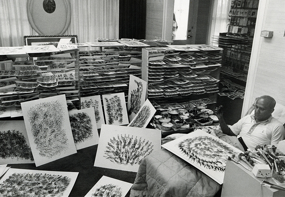 His mystical, often abstract works of art, vary from miniatures to murals, and include a multiplicity of styles and techniques. His intuitive approach to painting could lead to periods of tremendous intensity. Eleven months after he began his art journey, he completed his first 100,000 paintings and on 16 November 1975, he painted a remarkable 16,031 paintings in one 24-hour period.