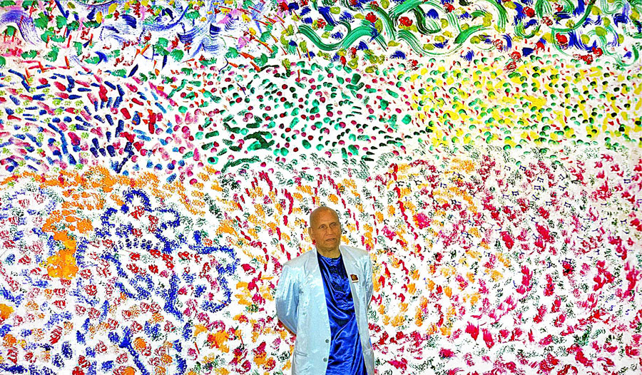 Sri Chinmoy by one of his large artworks.