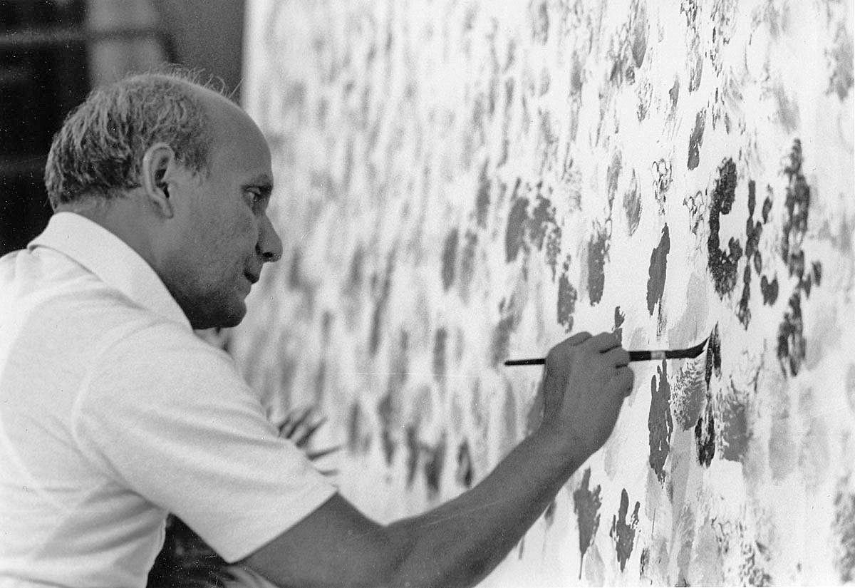 Sri Chinmoy during a prolific day of painting - surrounded by artworks which are drying.